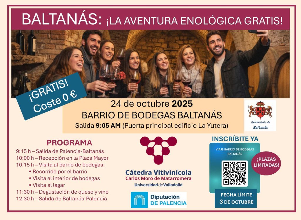 La Cátedra Vitivinícola Carlos Moro de Matarromera de la Universidad de Valladolid ha programado para el próximo mes de octubre (viernes 24) la visita al Barrio de Bodegas de Baltanás. El acceso es gratuito, pero se requiere inscripción antes del 3 de octubre. Ver cartel con todos los datos relativos al evento aquí: