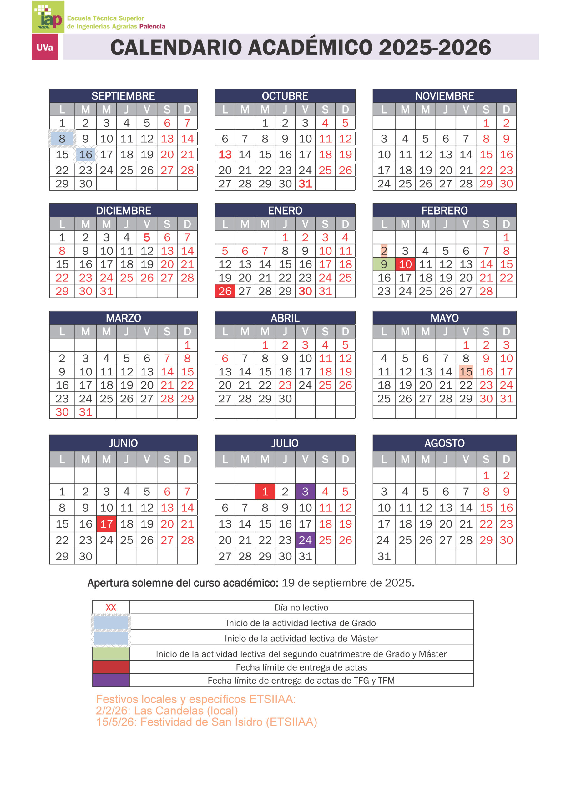 Este calendario es una versión del calendario académico de la Universidad de Valladolid, en la cual aparecen sombreados en naranja los festivos que afectan a nuestro campus de Palencia, así como festividades propias del Centro, ver leyenda.