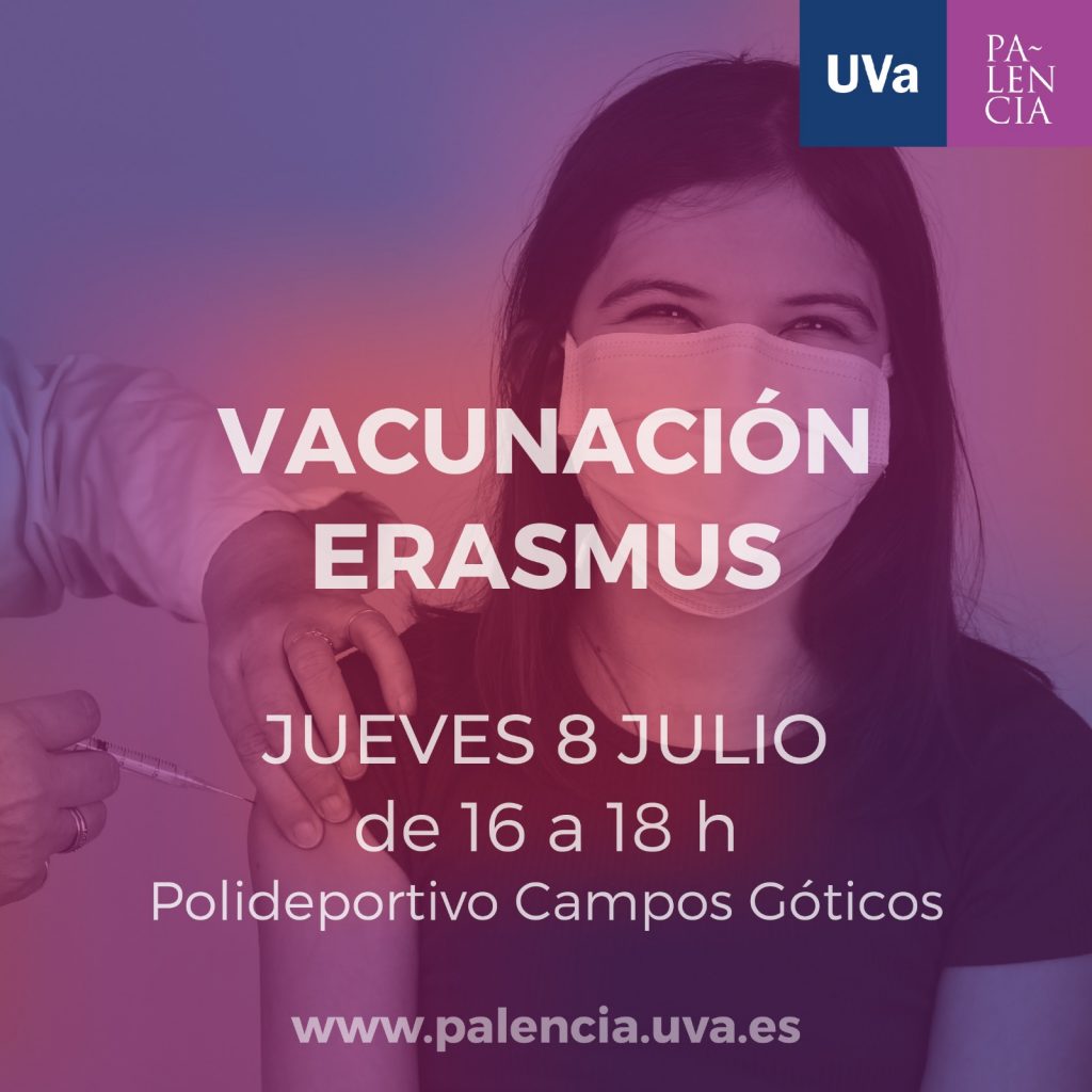 Los estudiantes incluidos en el programa ERASMUS del curso 2021-22 tienen una cita para recibir la vacuna COVID el próximo jueves 8 de julio de 16:00 a 18:00 h. en el Polideportivo Campos Góticos. Palencia.