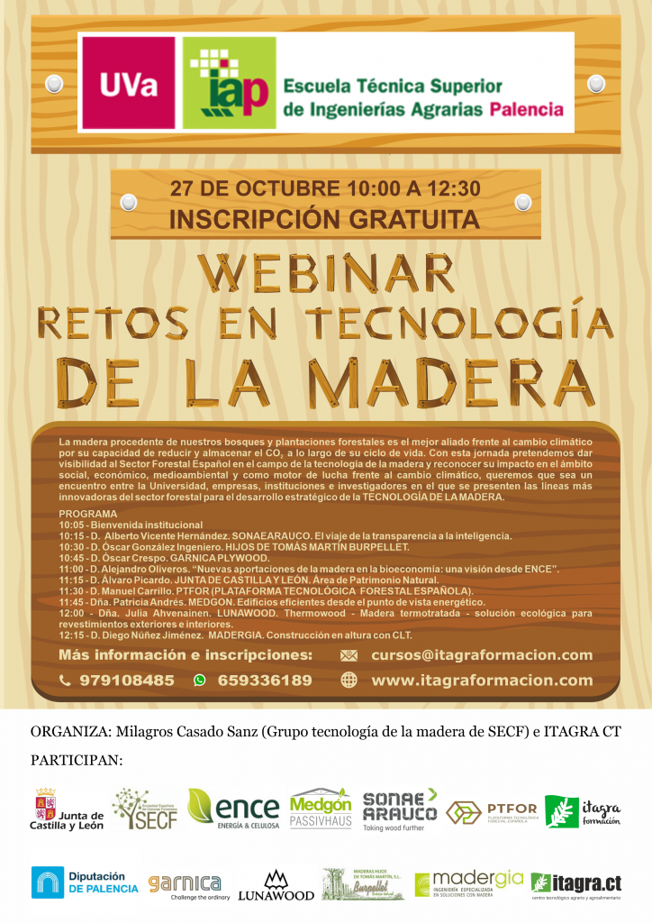 El próximo día 27 de octubre a las 10.00h tendrá lugar (Zoom online) el Webinar: RETOS EN TECNOLOGÍA DE LA MADERA que organiza Milagros Casado Sanz (Grupo tecnología de la madera) de la Escuela Técnica Superior de Ingenierías Agrarias de Palencia e Itagra CT. La madera procedente de nuestros bosques y plantaciones forestales es el mejor aliado […]