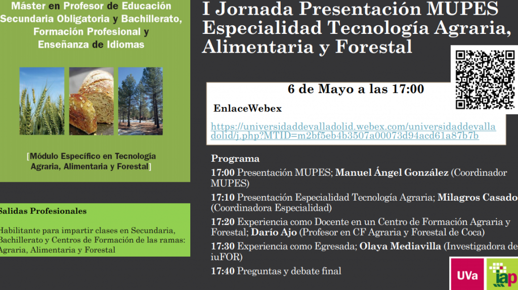 I Jornada Presentación MUPES Especialidad Tecnología Agraria, Alimentaria y Forestal. Jornada Virtual Día y Hora: 6 de Mayo a las 17:00 Programa 17:00 Presentación MUPES; Manuel Ángel González (Coordinador MUPES) 17:10 Presentación Especialidad Tecnología Agraria; Milagros Casado (Coordinadora Especialidad) 17:20 Experiencia como Docente en un Centro de Formación Agraria y Forestal; Darío Ajo (Profesor en […]
