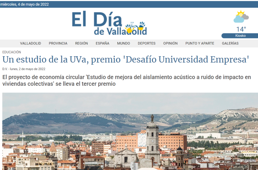 El proyecto de economía circular ‘Estudio de mejora del aislamiento acústico a ruido de impacto en viviendas colectivas con forjados mixtos de madera y hormigón mediante incorporación de NFU’, propuesto por la Universidad de Valladolid ha obtenido el tercer premio en la novena edición del concurso ‘Desafío Universidad-Empresa’ integrado en el Plan de Transferencia de […]