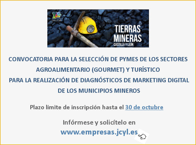 CONVOCATORIA «SERVICIOS PERSONALIZADOS A PYMES DE LOS SECTORES AGROALIMENTARIO Y TURÍSTICO DE LOS MUNICIPIOS DE TIERRAS MINERAS» La fecha para la recepción de solicitudes finaliza el 30 de octubre. Más Información: ENLACE